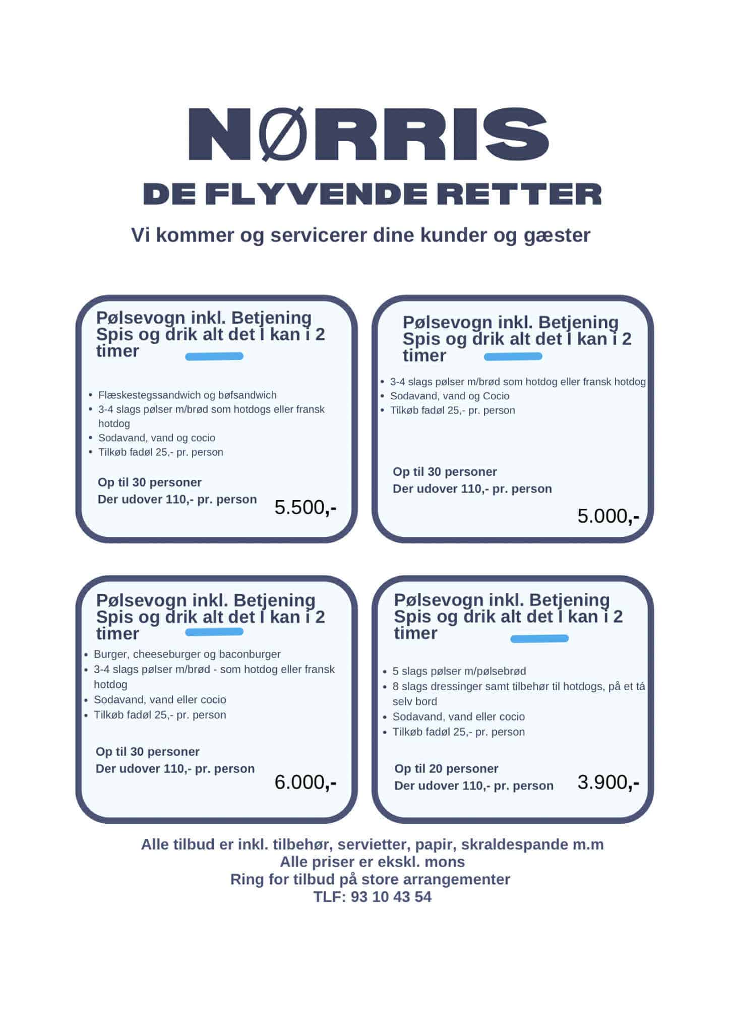 Serveringen foregår typisk som “spis og drik alt det I kan” i cirka to timer. Kontakt Norris De Flyvende Retter for menu, priser og ledige datoer.